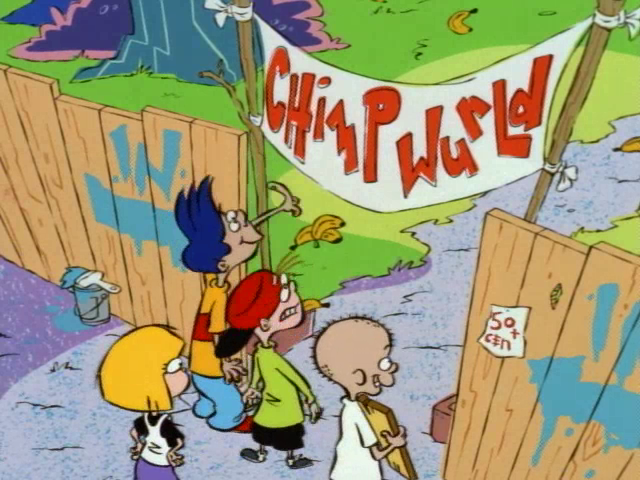 Chimp World (misspelled as "Chimp Wurld") was the Eds' scam from "See No Ed," which they thought was one of their greatest scams. The Kids of the Cul-de-Sac found some strange things originating from Chimp World after they realized that the Eds went missing. The first item found was the monkey mask, then a monkey hand glove, bottle cap and a trail of bananas, which led them all to Chimp World. The kids played there without spending their money but Kevin was hesitant, claiming that the Eds were watching their every move. The Eds were not present at the scam as they were busy searching for Ed's lost monkey mask.